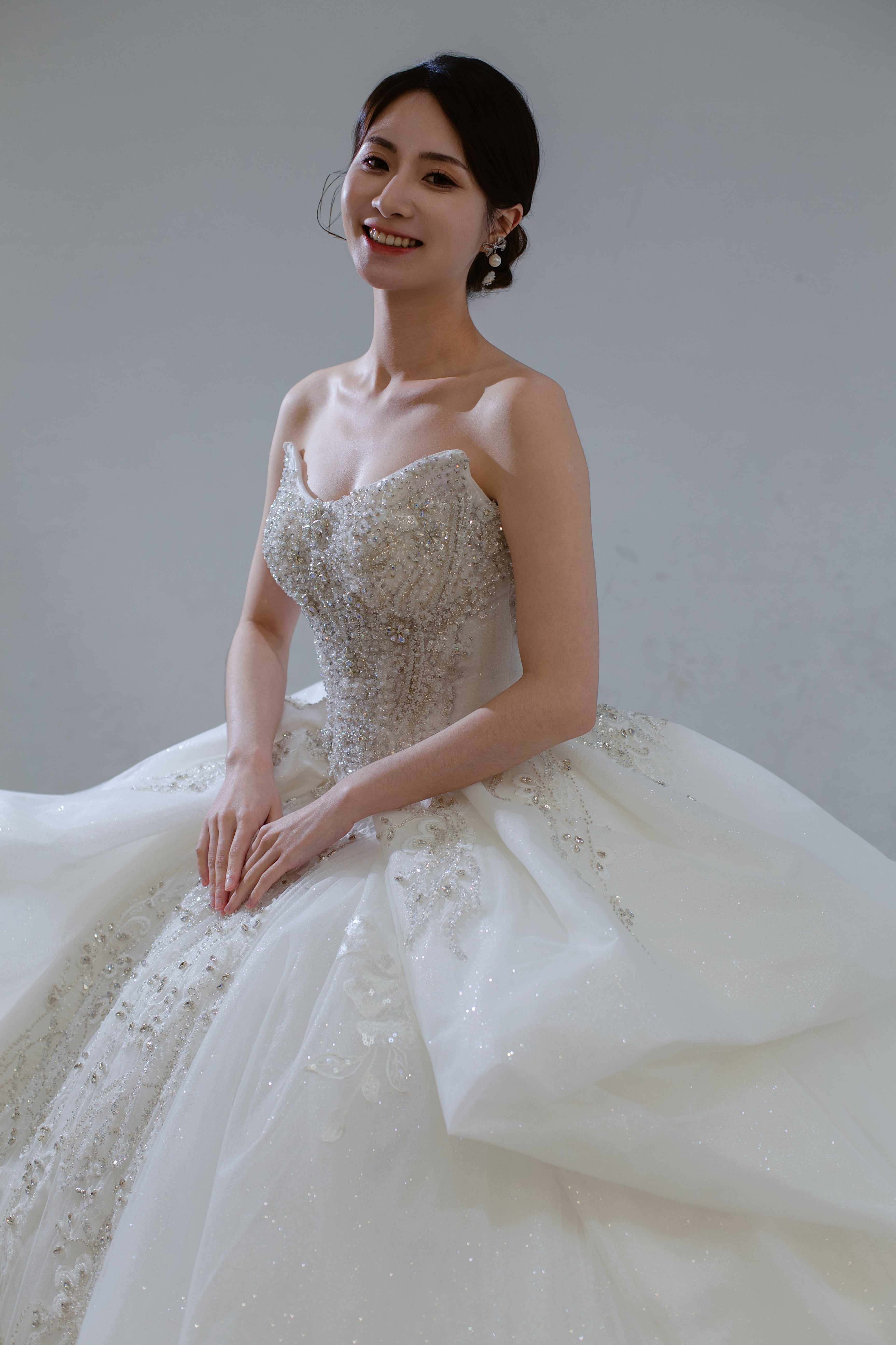這款主婚紗以滿版精緻珠飾與立體刺繡打造出閃耀細節,上身修身設計搭配份量感十足的大澎裙,呈現經典又夢幻的公主輪廓。